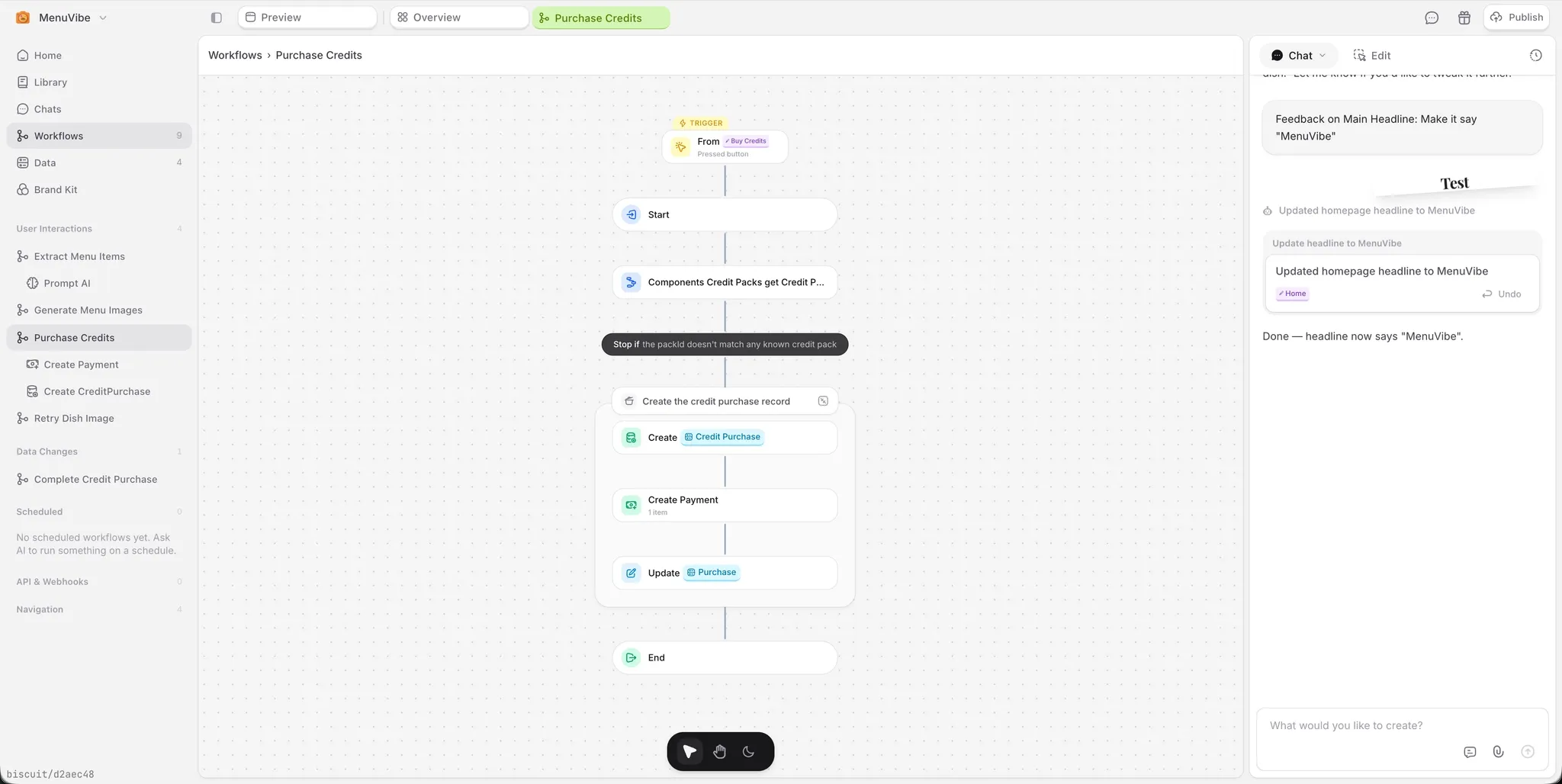 So there's a full purchase flow (start checkout, listen for payment, update credits), a menu extraction pipeline that reads dish names from a photo, and AI image generation for each dish. All built-in.