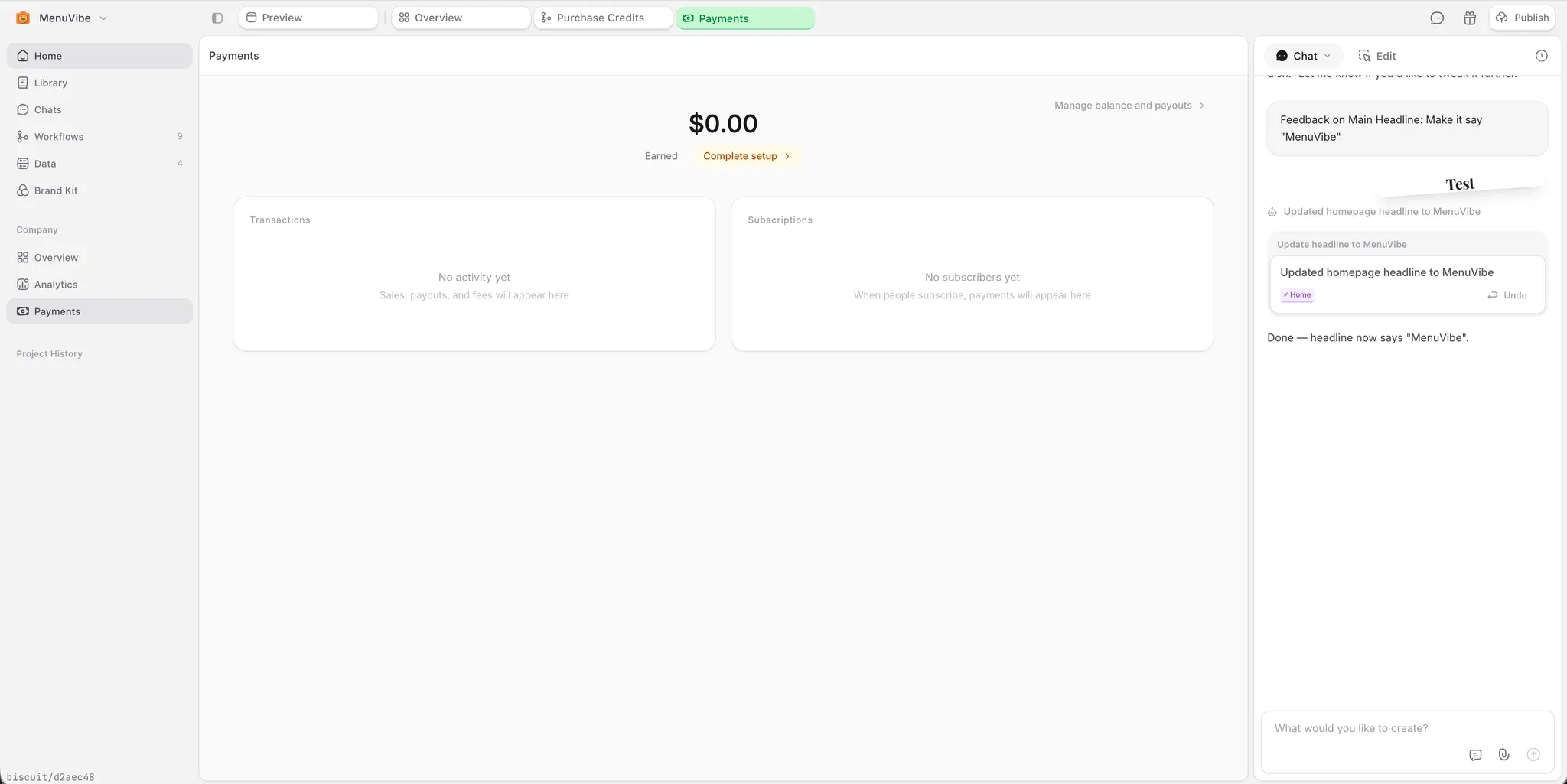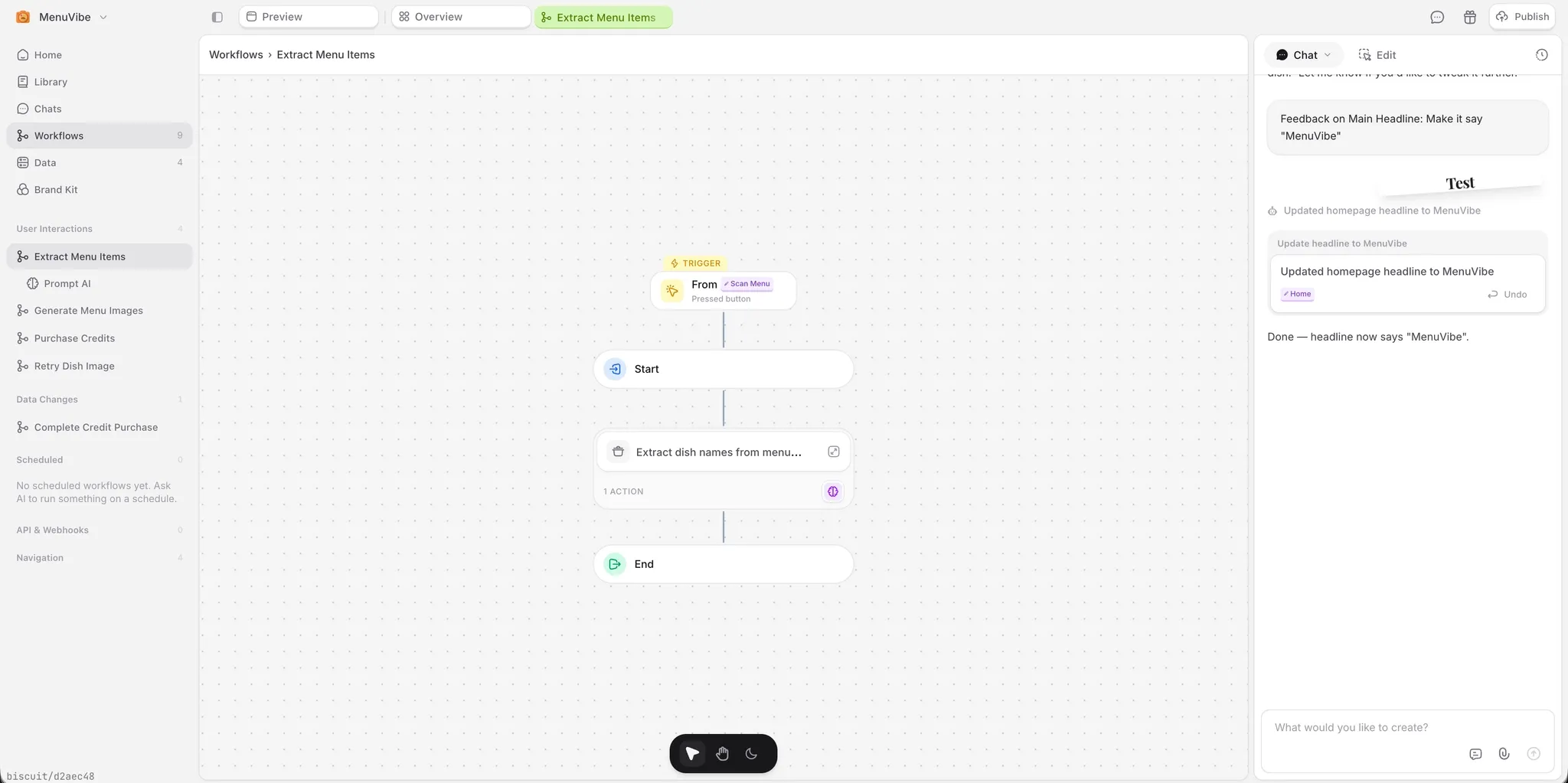 Oh, and there was this funny naming thing. The AI kept calling the app "MenuGen" in its messages because it picked up the name from the URL I shared. The name generator didn't have access to the earlier research where it had already decided on "MenuVibe." You can see me correcting it in the chat panel of the first screenshot, which was pretty funny.