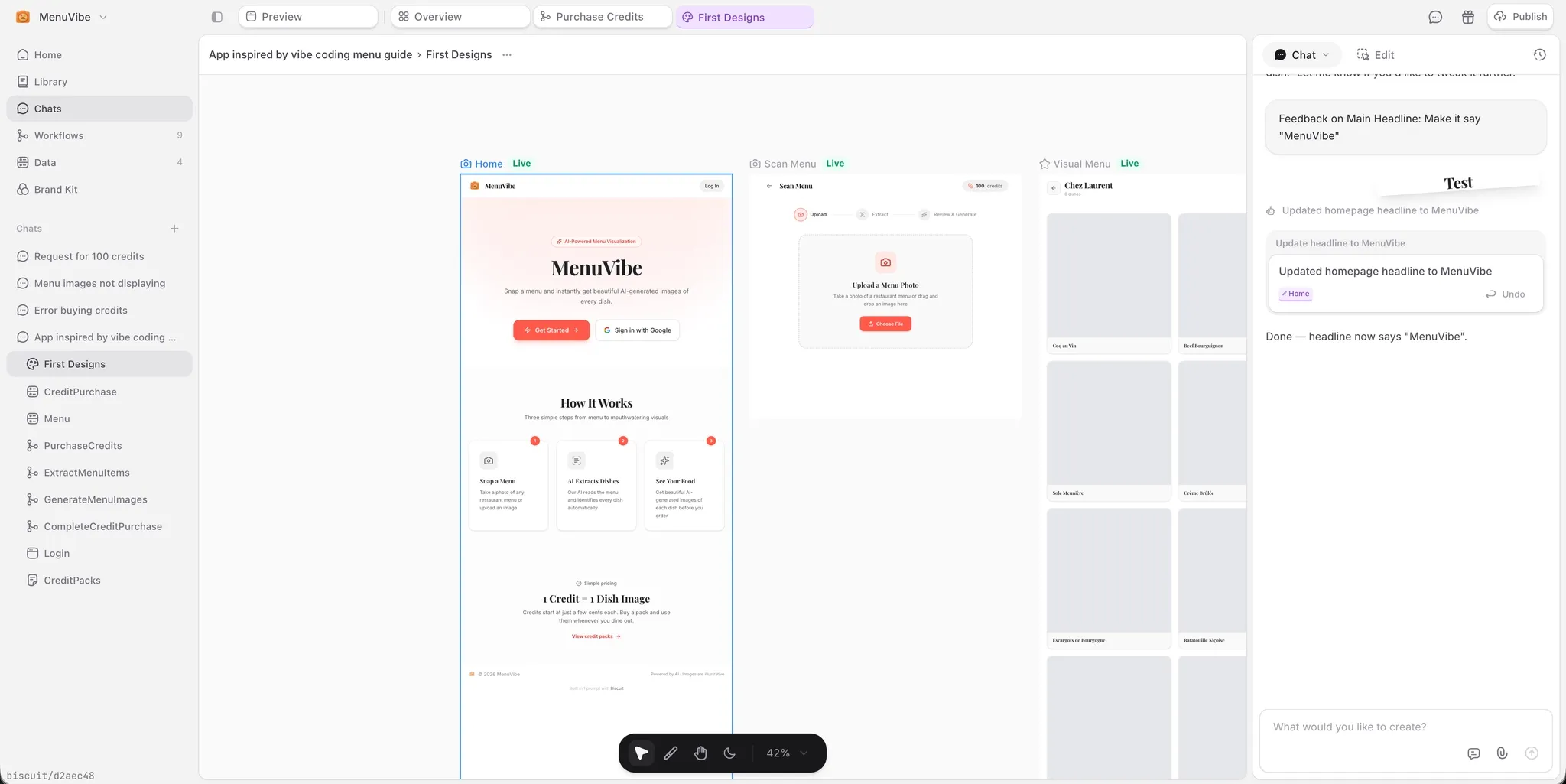 Out of that one prompt, Biscuit built three pages: a homepage, a credit purchase page, and the actual menu generation page where you upload a photo of a menu and get AI-generated images of every dish.